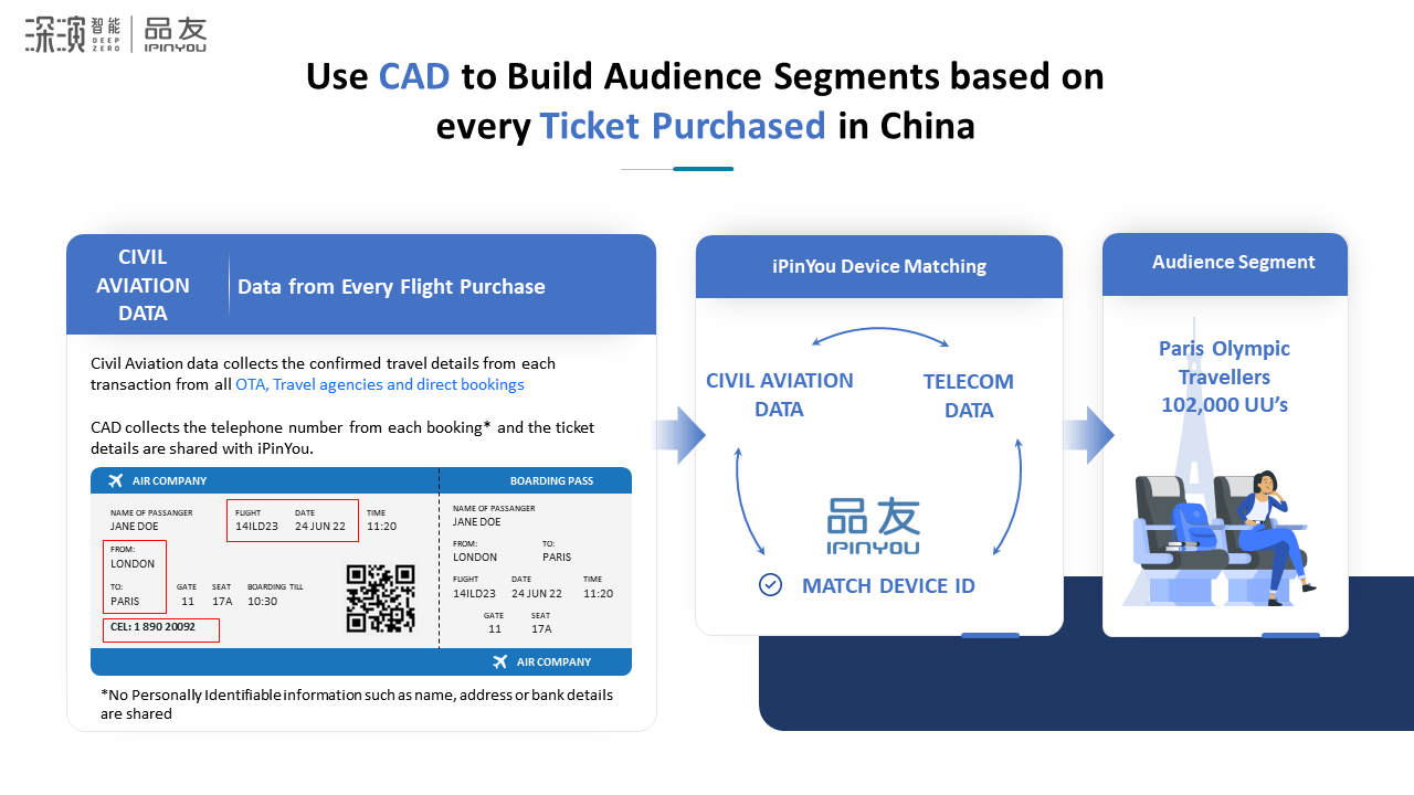 **Partnership with Chinese Civil Aviation Data**: To assist brands in reaching Chinese travelers who have confirmed their outbound trips, we are proud to announce that iPinYou has collaborated with Chinese Civil Aviation Data (CAD) to develop cutting-edge solutions in the travel industry. Leveraging data from over 700 million ticket purchases, this partnership offers an unparalleled opportunity to engage with Chinese travelers. [Read more about CAD here. ]